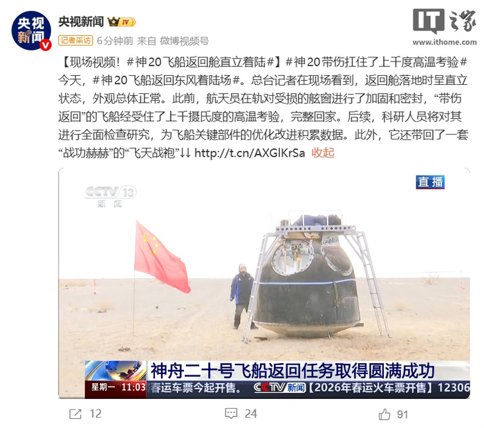 IT之家 1 月 19 日消息,据中国载人航天工程办公室消息,北京时间 2026 年 1 月 19 日 9 时 34 分,神舟二十号飞船返回舱在东风着陆场成功着陆。经现场检查确认,神舟二十号飞船返回舱外观总体正常,舱内下行物品状态良好,神舟二十号飞船返回任务取得圆满成功。