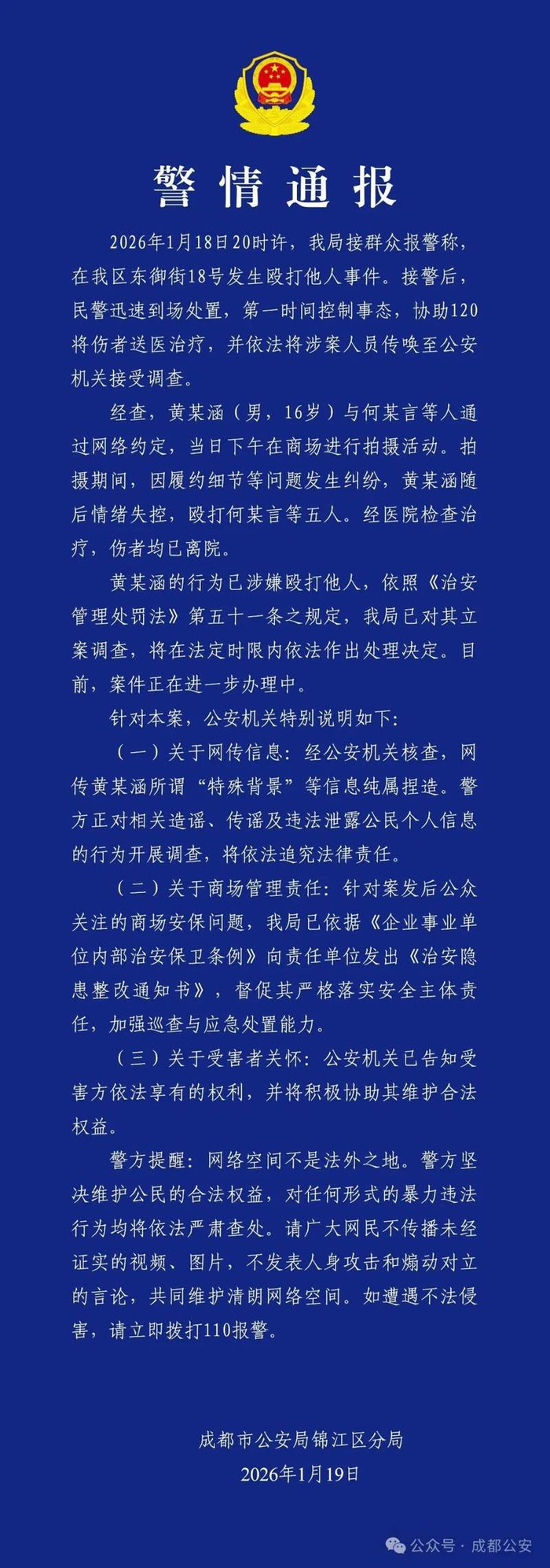 新京报讯 2026年1月19日,成都市公安局锦江区分局发布警情通报: