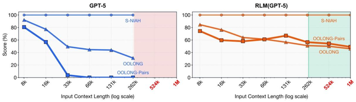 实验显示,RLM 有效处理规模已突破千万级 Token,超过 GPT-5 等前沿模型原生上下文窗口的两个数量级。