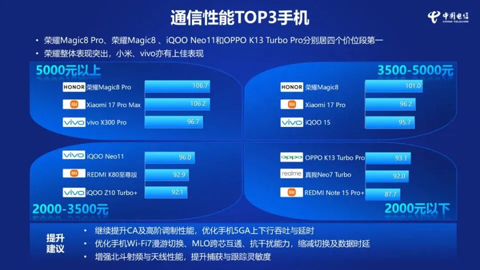 报告最后还给出了通信性能Top3机型,中国电信表示:荣耀Magic8 Pro、荣耀Magic8、iQOO Neo11和OPPO K13 Turbo Pro分别居四个价位段第一。荣耀整体表现突出,小米、vivo亦有上佳表现。其中5000元以上前三是:荣耀Magic8 Pro、小米17 Pro Max、vivo X300 Pro;3500-5000元综合前三是:荣耀Magic8、小米17 Pro、iQOO 15;2000-3500元前三是:iQOO Neo11、REDMI K80至尊版、iQOO Z10 Turbo;2000元以下前三是:OPPO K13 Turbo Pro、真我Note7 Turbo、REDMI Note 15 Pro+。