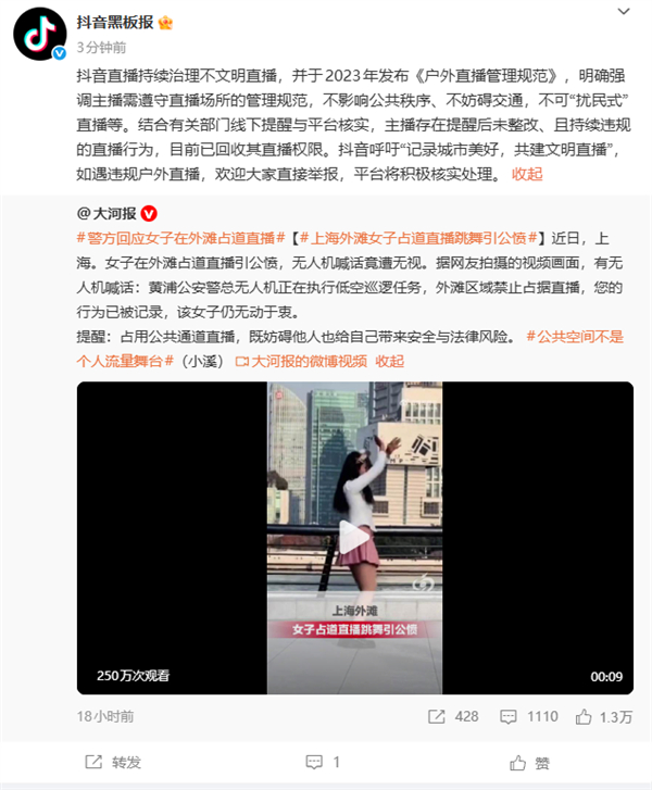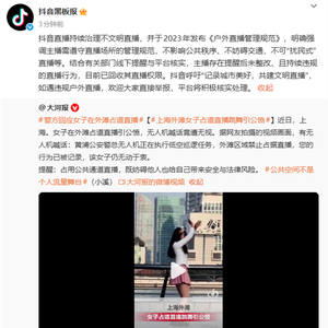 抖音方面指出,平台早在2023年便发布《户外直播管理规范》,明确强调主播需遵守直播场所的管理规范,不影响公共秩序、不妨碍交通,不可“扰民式”直播等。