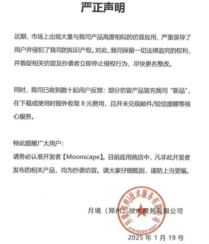 声明表示,近期,公司已经收到数十起用户反馈称,部分仿冒产品冒充死了么APP“新品”,在下载或使用时额外收取8元费用,且并未兑现邮件/短信提醒等核心服务。声明称务必认准开发者“Moonscape”,目前应用商店中,凡非此开发者发布的相关产品,均为抄袭仿冒。