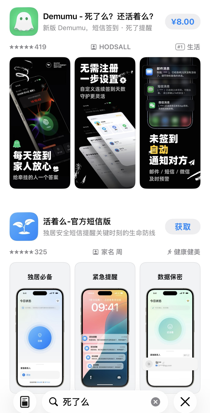 1月19日,界面新闻查询苹果和安卓应用商店,均无法搜索到“死了么”,但存在大量同类应用。其中,在苹果应用商店,一款名为“Demumu-死了么?还活着么?”的软件付费8元可下载,该款软件显示,开发者为HODSALL,其图标和已经下架的死了么APP几乎一模一样。