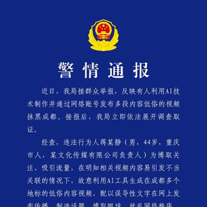 近日,我局接群众举报,反映有人利用AI技术制作并通过网络账号发布多段内容低俗的视频抹黑成都。