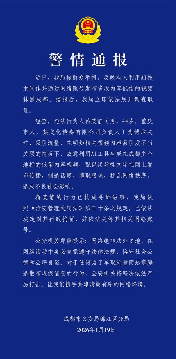 经查,违法行为人蒋某静(男,44岁,重庆市人,某文化传媒有限公司负责人)为博取关注、吸引流量,在明知相关视频内容易引发不当关联的情况下,故意利用AI工具生成在成都多个地标的低俗内容视频,配以误导性文字在网上发布传播,制造话题、博取眼球,扰乱网络秩序,造成不良社会影响。