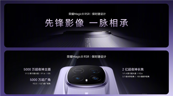 影像上,荣耀Magic8 RSR 保时捷设计搭载5000万超夜神主摄与2亿超夜神长焦,配合全新AiMAGE原色引擎,全维度还原真实色彩,还有行业领先的AiMAGE防抖引擎,防抖能力进化至CIPA 6.5级,长焦手持3秒不糊片。