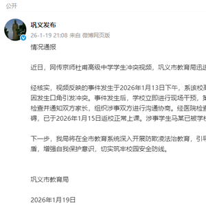 经核实,视频反映的事件发生于2026年1月13日下午,系该校高一学生马某与谷某因发生口角引发冲突。事件发生后,学校立即进行现场干预,第一时间将谷某送医检查并通知双方家长,组织涉事双方进行沟通协商。经医院检查,学生谷某身体无碍,已于2026年1月15日返校正常上课。涉事学生马某已被学校劝退。
