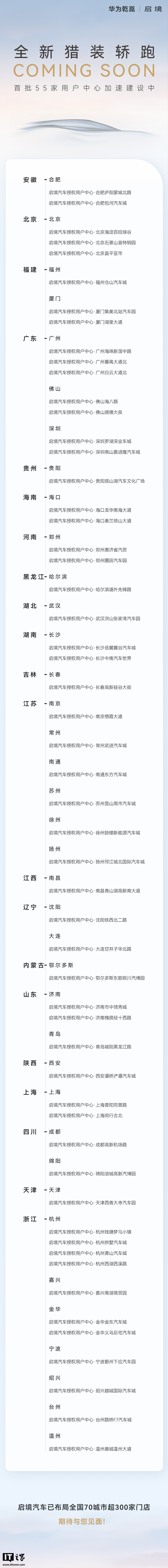 华为乾崑 | 启境汽车全国首批 55 家门店官宣,覆盖安徽、北京、广东等地