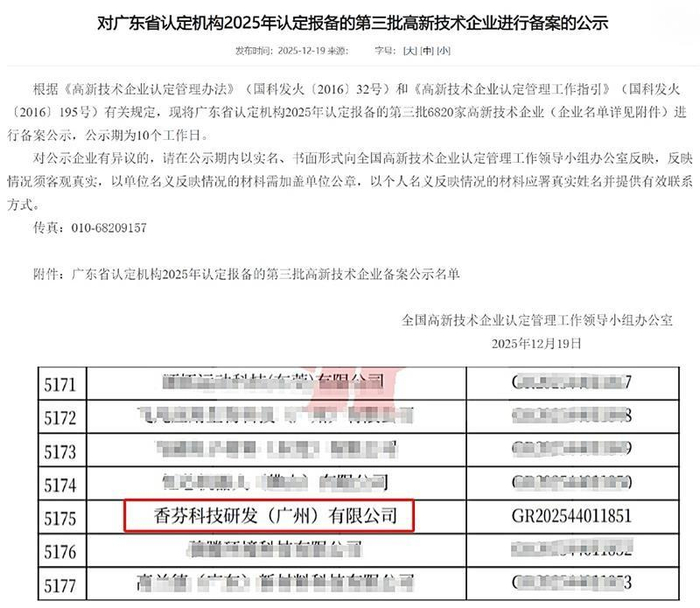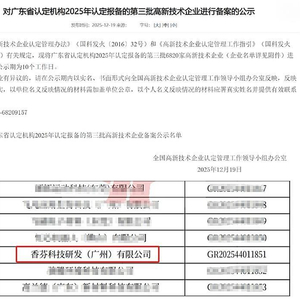 近日,广州衍馥生物科技有限公司(以下简称“衍馥科技”)正式宣布,其全资控股的核心研发主体——香芬科技研发(广州)有限公司,已成功通过由科学技术部、财政部、国家税务总局联合组织的“国家高新技术企业”认定评审。根据认定流程,该公司预计将于2026年3月获颁《高新技术企业证书》。
