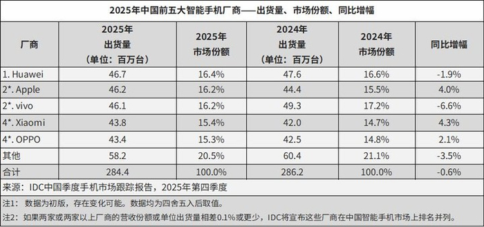 - 华为在 2025 年全年重返中国智能手机出货量榜首,全年出货量约 4670 万台,市场份额 16.4%。