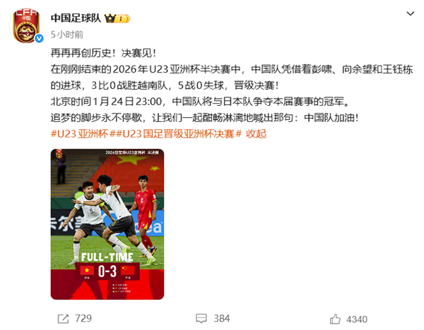 3:0完胜越南创造历史!U23国足闯入亚洲杯决赛:将对战日本