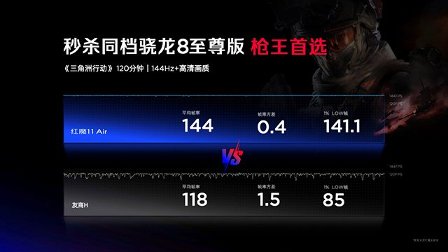 在发布会上,红魔官方也展示了红魔11 Air的游戏实测水平。在144Hz高清画质下运行120分钟《三角洲行动》,红魔11 Air平均帧率为144帧,1%LOW帧为141.1帧,对比机型平均帧率为118帧,1%LOW帧为85帧。