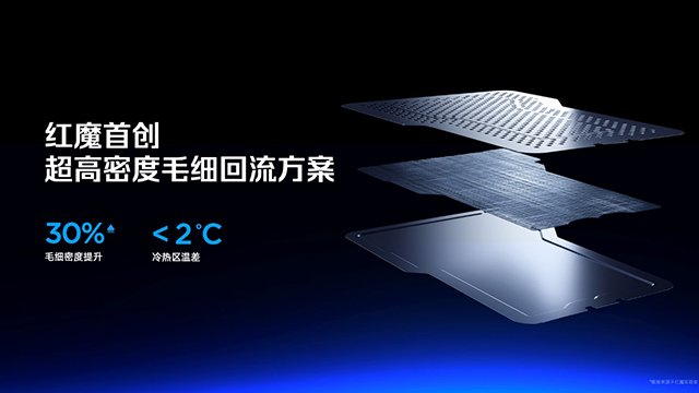 VC均热板内部也有创新,红魔首创了超高密度毛细回流方案,毛细密度提升了30%,冷却液回流速度大幅提升。据红魔官方宣称,超厚冰阶VC能够实现小于2°C的冷热区温差,为手机带来强劲均热、散热能力。
