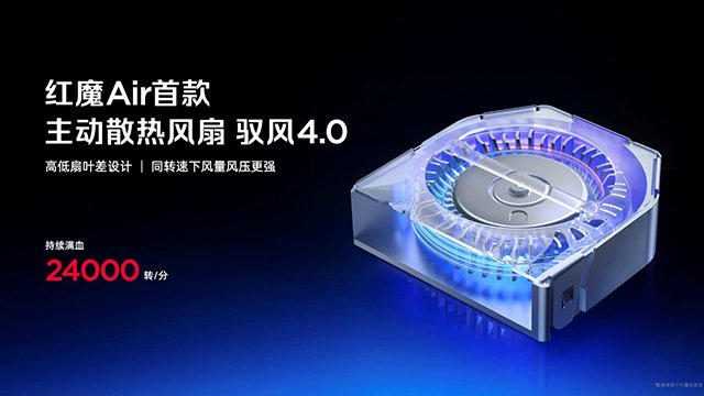 红魔11 Air这一次直接在Air机型上,首次搭载了主动散热风扇——驭风4.0,可实现每分钟24000转持续转速。