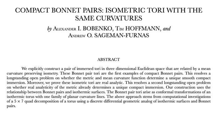 Bonnet 环面的发现是对 Bobenko 和 Hoffmann 数十年来在离散曲面研究方面工作的有力验证。传统上,光滑形状的几何学发展速度更快,而离散几何学的理论发展相对滞后。但在这项工作中,离散理论取得了突破性进展,并最终促成了光滑曲面方面的进展。