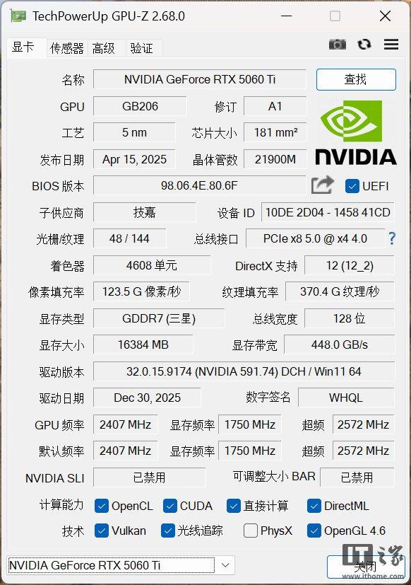 虽说体积小巧,但技嘉 AORUS RTX 5060 Ti AI BOX 内置的还是桌面端显卡,其基于最新一代 GB206-300 核心和 TSMC 4N 制程工艺打造,CUDA 核心数量为 4608 个,相比前代 RTX 4060 Ti 的 4352 个 CUDA 核心提升 5.88%。另外,还包括 144 个第五代 Tensor Cores、36 个第四代 RT Cores。另外,其配备 16GB 显存,在开启 DLSS 玩游戏时基本不会爆显存,要明显好于 8GB 版的 RTX 5060 Ti 。该显卡的大致性能定位,请前往IT之家 App - 发现频道的显卡天梯图予以查看。
