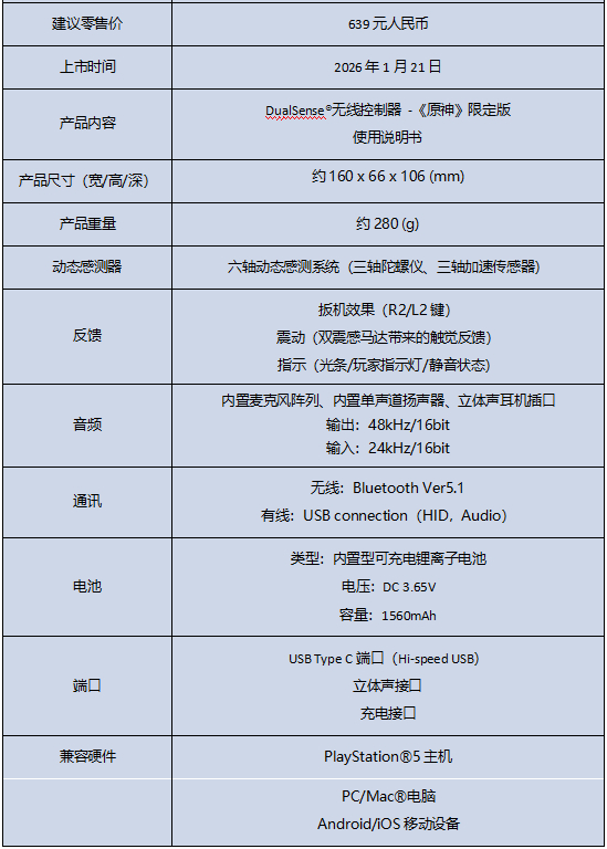 IT之家附索尼 PS5《原神》限定版 DualSense 无线控制器国行产品参数如下: