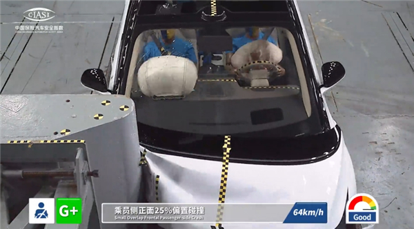 碰撞视频显示,在驾驶员和乘员侧25%偏置碰撞测试中(64km/h),车辆A柱没有结构变形,全车气囊及时起爆,车内驾乘人员均为受到严重伤害。