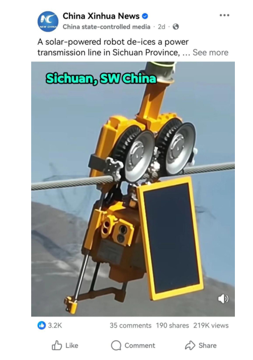 整个作业过程无需人工现场介入,机器人可在50公里外的指挥中心远程指令下自主完成除冰任务。其采用太阳能供电,除冰效率是工人的十倍,还能完成线路巡检。