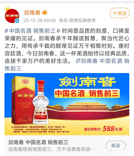 近日,剑南春官方微博账号发布产品宣传文,其中再提了“中国名酒 销售前三”的广告语。