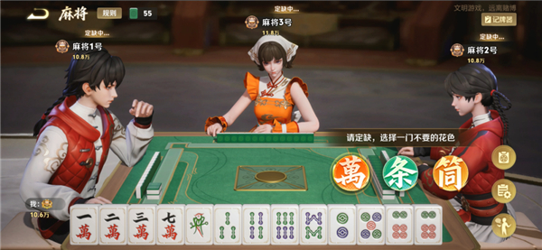 对局开始时,依次进行“换三张”——选择3张同花色的手牌,按逆时针顺序进行交换,“定缺牌”——选择1门花色作为本局缺门,胡牌时手牌中不能含有此花色的牌。