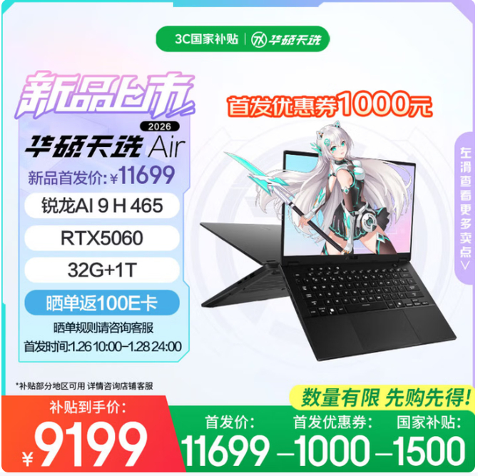 华硕天选Air 2026系列新品开启预约:14英寸高性能轻薄本天花板,国补加持闭眼入