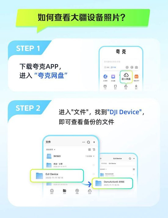 随着摄像技术快速发展,如何存储日益庞大的影像文件,正成为许多用户的难题。近日,夸克网盘与大疆设备达成合作,上线相机云服务,目前已支持Osmo Action 6的8K视频无损备份,1000张照片备份最快仅需2分钟,SVIP用户还可拥有6TB超大存储空间,极大缓解存储焦虑。