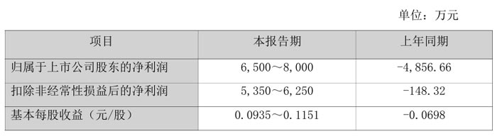 报告期内,公司归属于上市公司股东的净利润预计为 6500 万元至 8000 万元,上年同期该数据为 - 4856.66 万元;扣除非经常性损益后的净利润预计为 5350 万元至 6250 万元,上年同期为 - 148.32 万元;基本每股收益预计为 0.0935 元 / 股至 0.1151 元 / 股,上年同期为 - 0.0698 元 / 股。