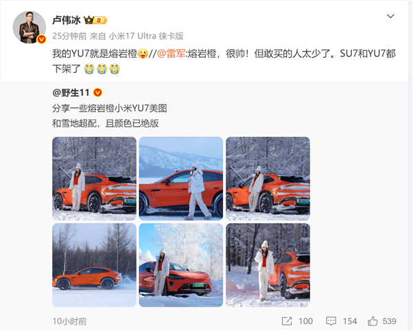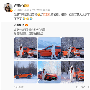 另外,还有车主晒出了自己的熔岩橙小米YU7,而雷军表示:“熔岩橙,很帅!但敢买的人太少了。SU7和YU7都下架了。”PS:卢伟冰的YU7也是熔岩橙....