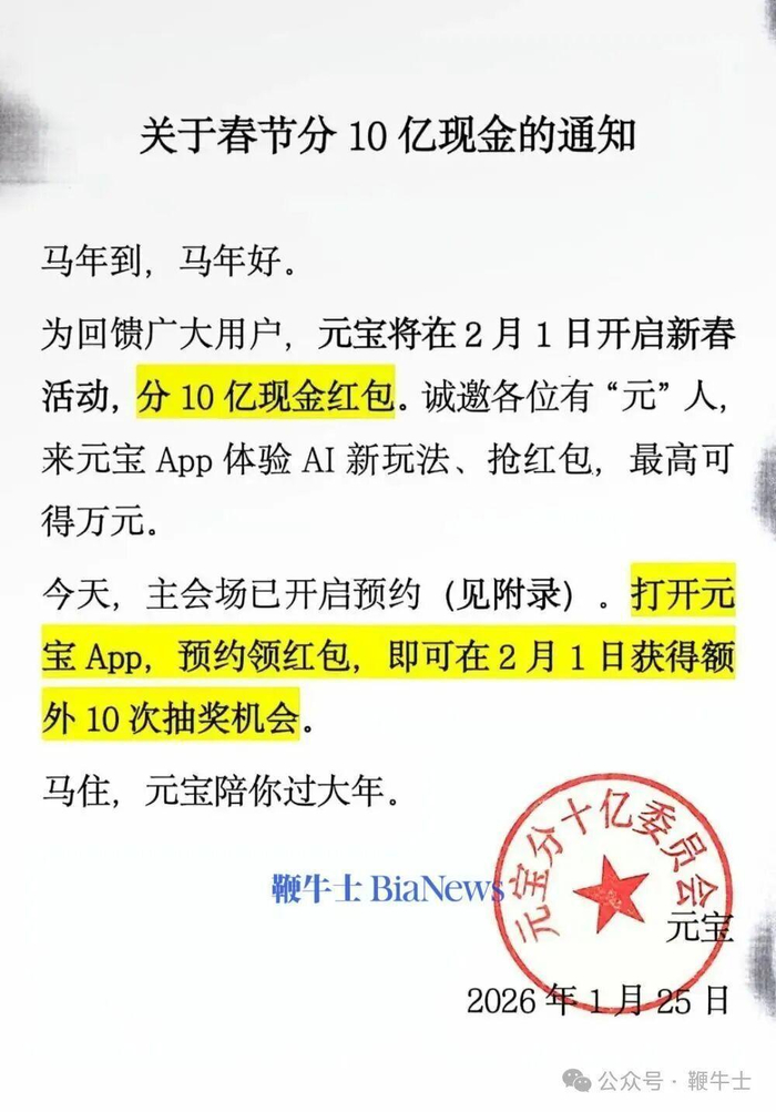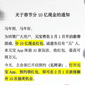 日前,腾讯元宝宣布,为回馈广大用户,将在2月1日开启新春活动,分10亿现金红包。