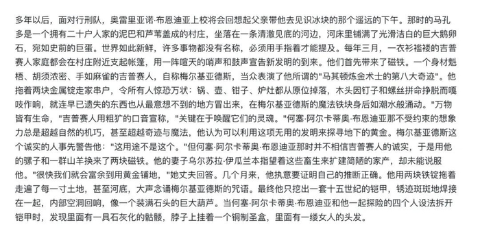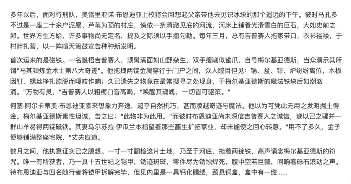 但它有时会显得用力过猛,把吉卜赛人和马孔多描绘得有点像中国古代传奇小说(比如「方生方始」、「提及之际须以手指勾勒」),稍微偏离了拉丁美洲的魔幻现实主义基调。