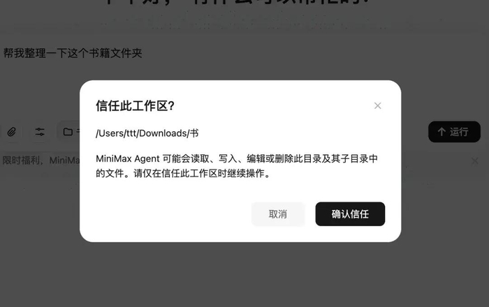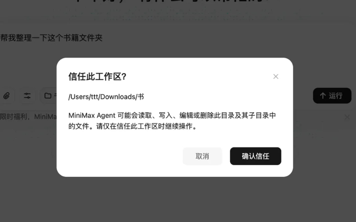 Agent 没有立刻动手,而是先请求了访问权限。需要我明确选中目标文件夹,并确认它可以读取和修改内容。