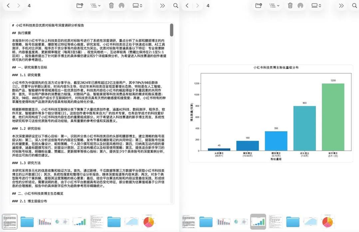第一个任务「深度调研」,MiniMax 调用 Web 搜索工具,检索最近一周的科技要闻、小红书科技博主的对标账号信息。搜索完成后,它自动提取关键信息,生成了一份详细的分析报告,包含账号定位、粉丝量级、内容类型、爆款特点等维度。