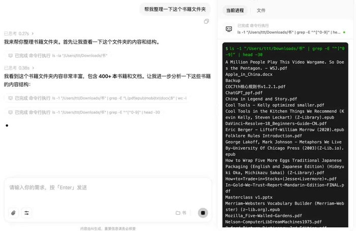 接下来,它才进入执行阶段。左边是对话窗口,右边是命令行操作。明确的书直接处理;无法从文件名判断内容的书,它会上网检索,然后再归类。