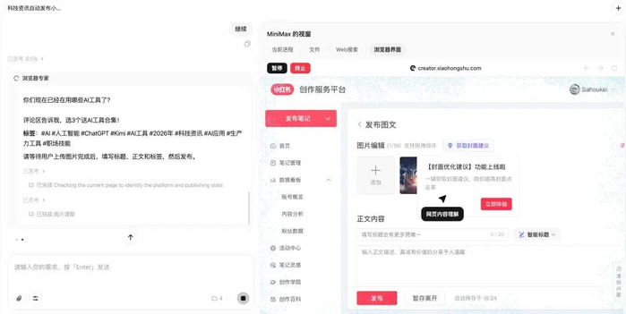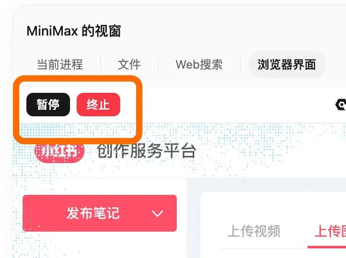 在 MiniMax 操作小红书后台的过程中,用户可以随时暂停、人工介入。