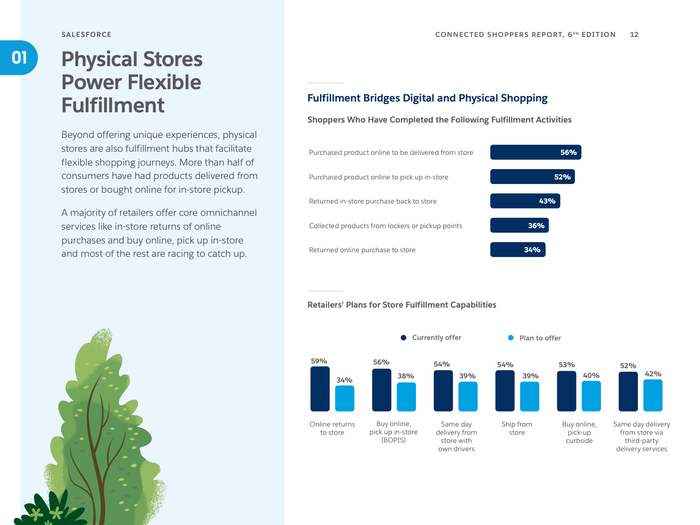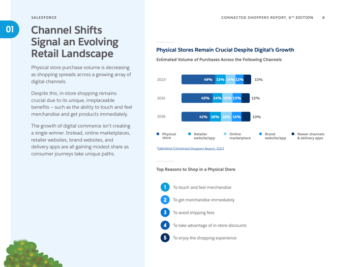 报告基于2024年11月至12月期间覆盖全球21个国家8350名消费者及1700名零售决策者的调研,全面揭示零售行业的最新趋势和数字化转型路径。零售业正经历多渠道融合的深刻变革,实体店在数字渠道快速增长背景下,不断转型为集体验与履约功能于一体的关键场所。尽管实体店的购买量预计从2024年的45%下滑至2026年的41%,但其触感体验、即时购买、免运费等优势仍不可替代。