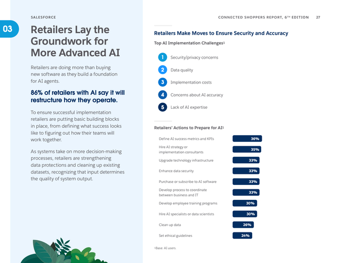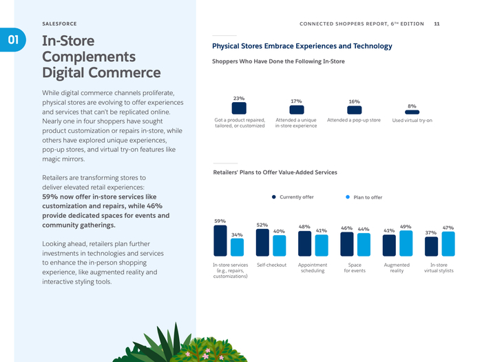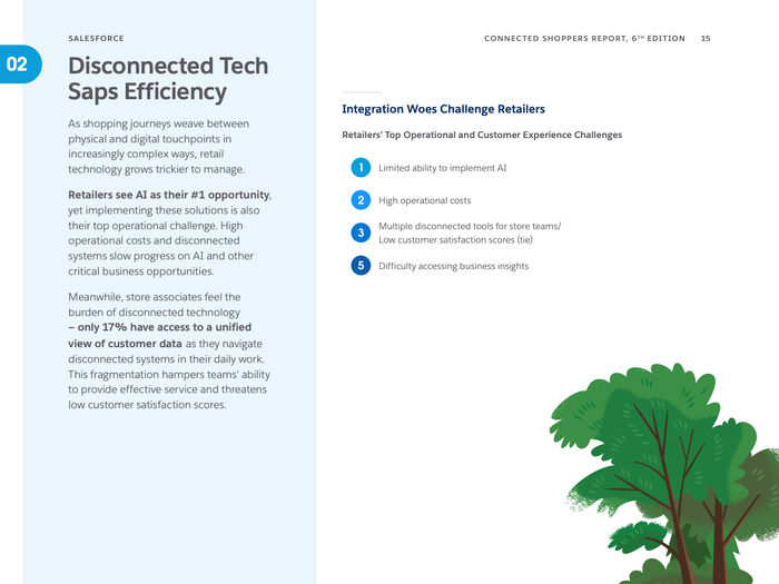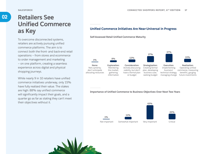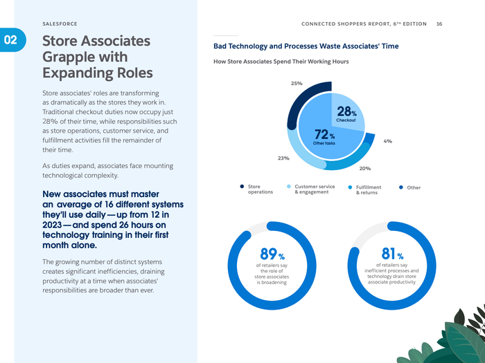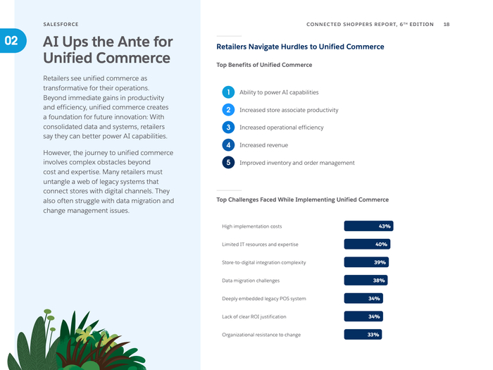 数字化购物渠道日益丰富,社交媒体成为主要的产品发现和购买平台,超半数消费者利用社交网络探索产品,尤其是年轻一代的Gen Z和千禧一代主导了这一趋势。零售商正紧锣密鼓推动一体化商业战略,88%表示未来两年该战略对业务极为重要,旨在打破前后台数据孤岛,提升门店及线上效率与客户体验。同时,81%的零售商指出技术碎片化对员工生产力构成严重制约,店员日常需操作多达16个系统,亟需技术优化以减轻负担。