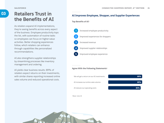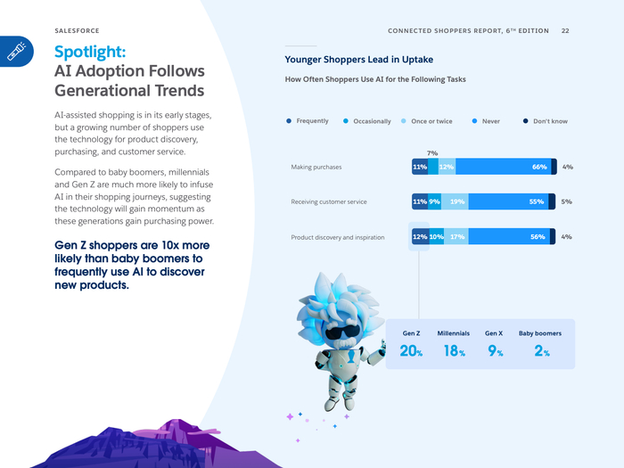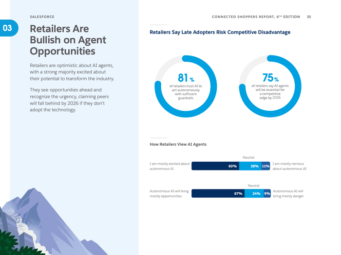 报告特别强调人工智能代理(AI Agents)的兴起,75%的零售商认为到2026年采用AI代理将是获得竞争优势的关键。AI技术不仅提升员工生产效率,优化库存物流,还在客户服务中显著增强体验,减少运营成本。年轻消费者中,AI辅助购物使用频率远高于老年群体,预示着AI应用将持续攀升。