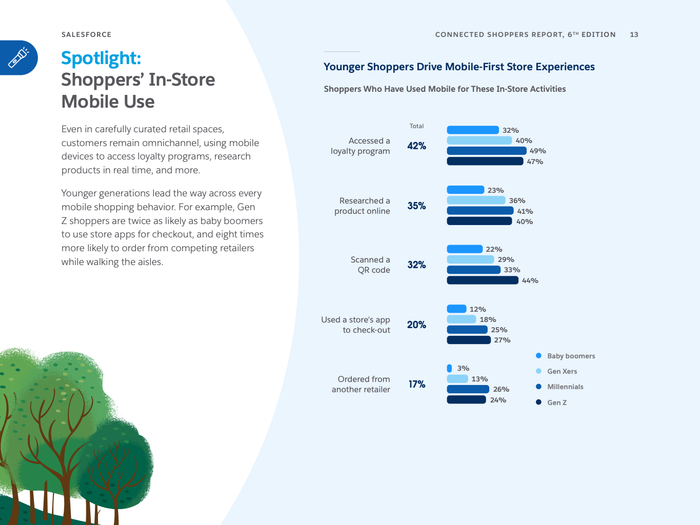 实体店面貌加速升级,59%的门店已提供产品定制与维修服务,46%规划或设有社区活动空间,同时积极投入增强现实、虚拟试妆等新技术,提升线下独特体验。移动端使用在购物中的占比逐年增长,Gen Z使用店铺App结账频率是老年群体的两倍,体现出移动优先购物模式的重要性。