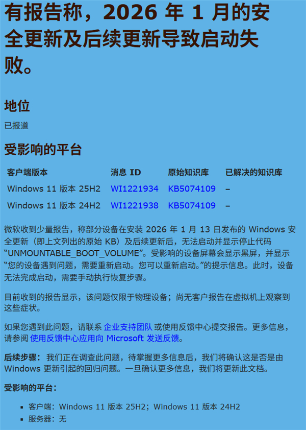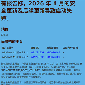 我们收到少量报告,称部分设备在安装2026年1 月13日发布的 Windows安全更新及后续更新后,无法启动并显示停止代码“UNMOUNTABLE_BOOT_VOLUME”。受影响的设备屏幕会显示黑屏,并显示“您的设备遇到问题,需要重新启动。您可以重新启动。”的提示信息。此时,设备无法完成启动,需要手动执行恢复步骤。”