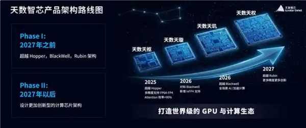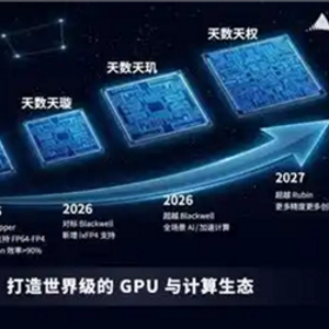 天数智芯AI与加速计算技术负责人单天逸公布四代架构路线图显示,2025年,天数天枢架构超越Hopper(H200系列);2026年,天数天璇架构对标Blackwell(B200);2026年,天数天玑架构超越Blackwell;2027年,天数天权架构超越Rubin;2027年之后将转向突破性计算芯片架构设计。