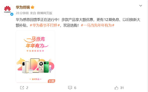 华为还宣布,春节期间不打烊(时间为2026年2月15日-2月23日),超25000家华为零售店、超1300家华为服务店正常营业。