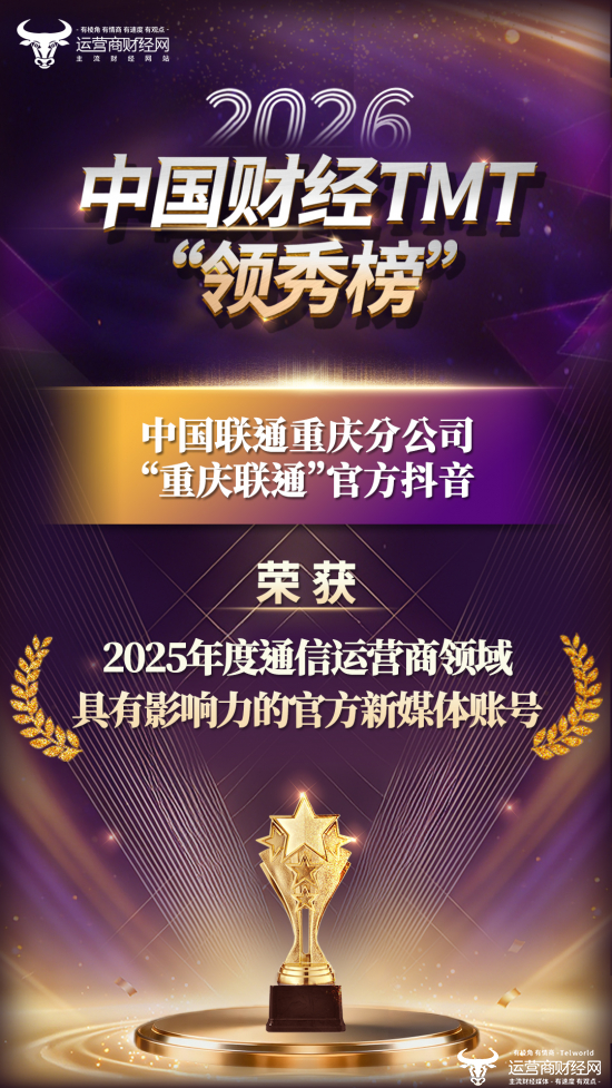 荣誉时刻!“重庆联通”官方抖音荣获“2025年度通信运营商领域具有影响力的官方新媒体账号”奖项!