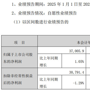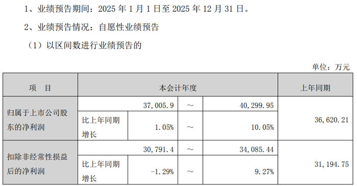 核心业绩数据方面,2025 年度公司归属于上市公司股东的净利润预计为 37005.9 万元至 40299.95 万元,较上年同期的 36620.21 万元增长 1.05% 至 10.05%;扣除非经常性损益后的净利润预计为 30791.4 万元至 34085.44 万元,较上年同期的 31194.75 万元变动幅度为 - 1.29% 至 9.27%。同时,公司 2025 年度营业总收入约为 474000 万元,同比增长约 12.52%,其中第四季度实现了较好的收入增速。此外,本报告期非经常性损益约为 6214 万元,上年同期为 5425 万元。