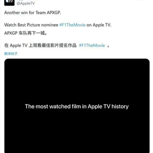 1 月 30 日消息,苹果昨日(1 月 29 日)通过其 Apple TV 官方 X 账号,宣布由布拉德 · 皮特主演的电影《F1:狂飙飞车》已超越《健听女孩》(CODA)及《花月杀手》等名作,成为 Apple TV 平台历史上收视率最高的影片。