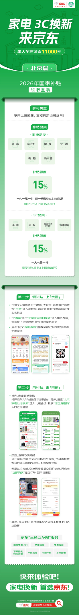 上京东,消费者购买活动指定的冰箱、洗衣机、电视、空调、电脑、热水器产品,单件/单次至高补贴1500元;购买活动指定的手机、平板、智能手表手环、智能眼镜产品,单件/单次至高补贴500元。单人累计至高可省11000元!