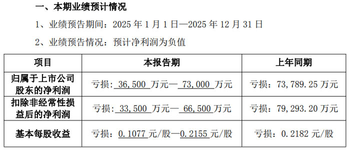 根据业绩预告,公司 2025 年业绩预告期间为 2025 年 1 月 1 日至 12 月 31 日,预计归属于上市公司股东的净利润亏损 36,500 万元 - 73,000 万元,上年同期该数据为亏损 73,789.25 万元;扣除非经常性损益后的净利润预计亏损 33,500 万元 - 66,500 万元,较上年同期的亏损 79,293.20 万元同样实现减亏;基本每股收益预计亏损 0.1077 元 / 股 - 0.2155 元 / 股,上年同期为亏损 0.2182 元 / 股。