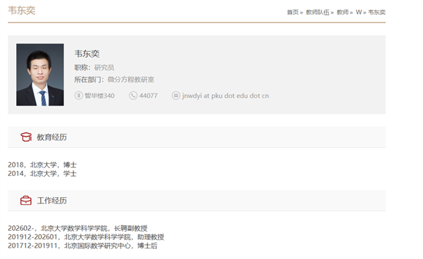 北京大学数学科学学院网站信息显示,从2026年2月起,该院教师韦东奕正式获聘北京大学长聘副教授。
