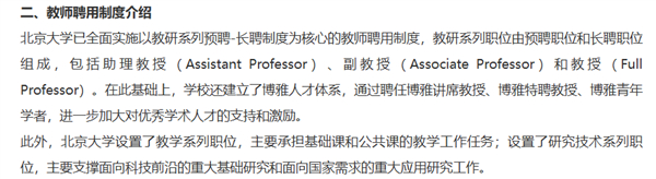 据北京大学人事部官网发布的相关规定,学校已全面实施以教研系列预聘—长聘制度为核心的教师聘用制度。