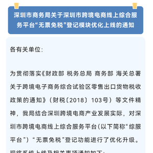 【亿邦原创】日前,深圳市商务局发布通知,已对深圳市跨境电商线上综合服务平台“无票免税”登记功能进行了优化升级,并于2026年2月1日正式上线运行。